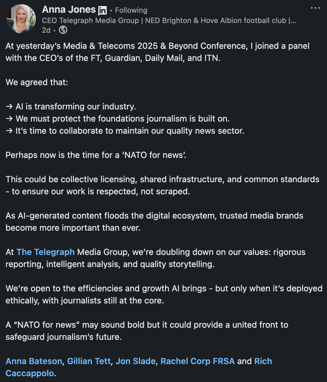 LinkedIn post from Anna Jones, CEO of Telegraph Media Group: